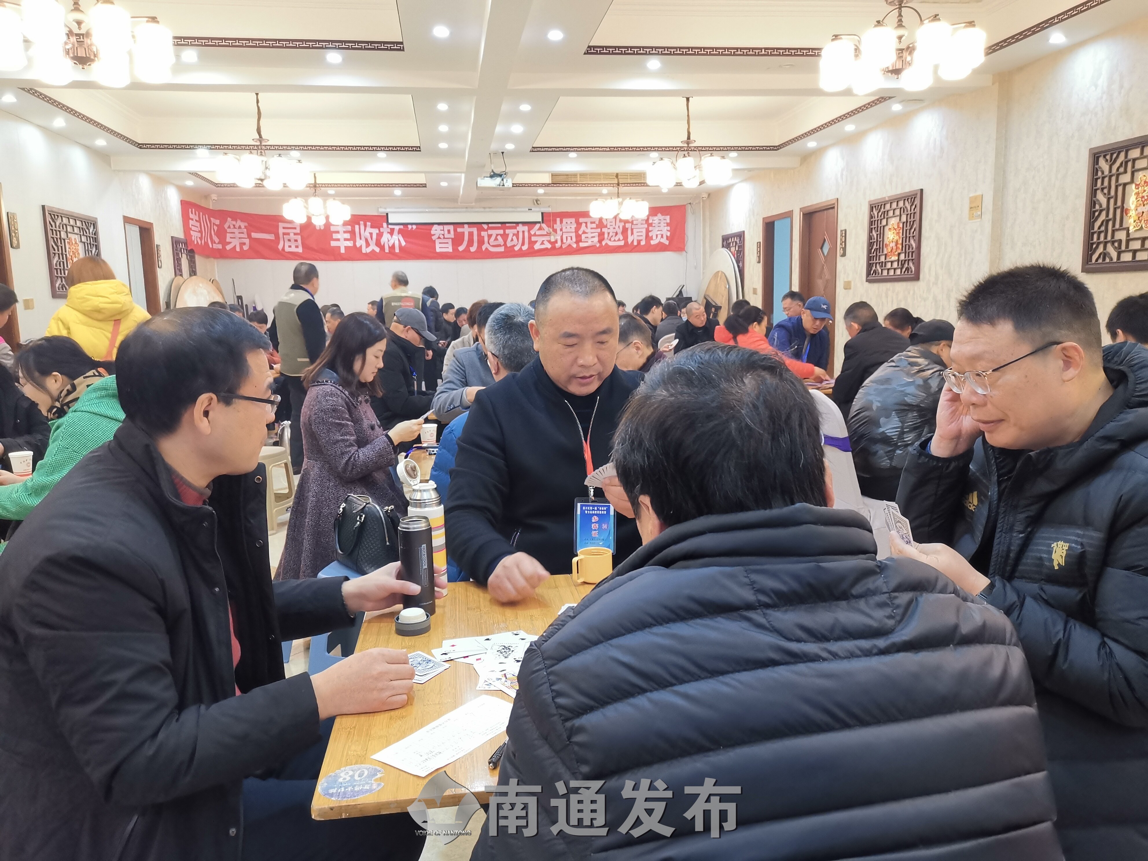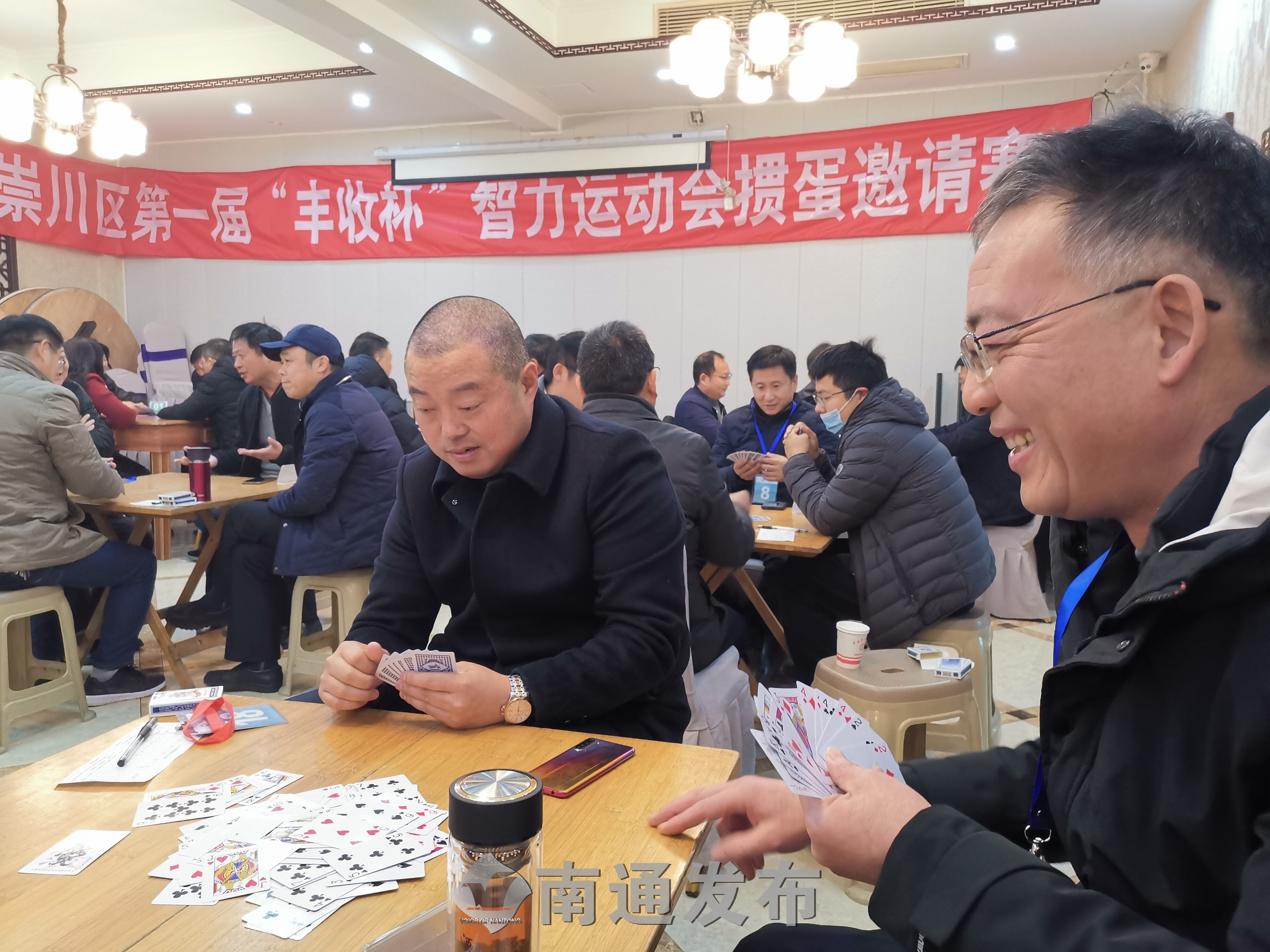 昨天(13日),在市区刀庖厨名郡店举行的崇川区第一届“丰收杯”智力运动掼蛋邀请赛,吸引了该区各街道和有关部门的80名掼蛋爱好者参赛。