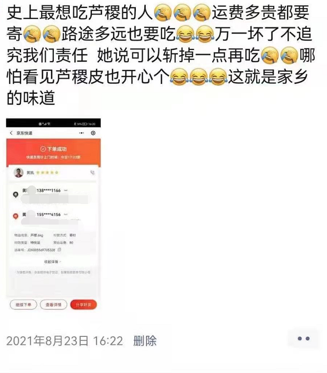 芦稷是保鲜时间很短的产品,收割后最多只能放三四天,否则会发红发干,为此,一开始,合作社的芦稷只发往江浙沪地区。不过,没想到在抖音上上传了几条短视频之后,网友反响强烈,尤其是不少常年在外的海门人,十分想念家乡的味道,即便是在很远的地方,也极力要求发货。朱建辉举了个例子,一位远在青海省的网友再三表示,即使邮费再贵,或者到货后芦稷有损坏,都由他本人负责,拜托卖家一定要寄来一盒来自家乡的芦稷。