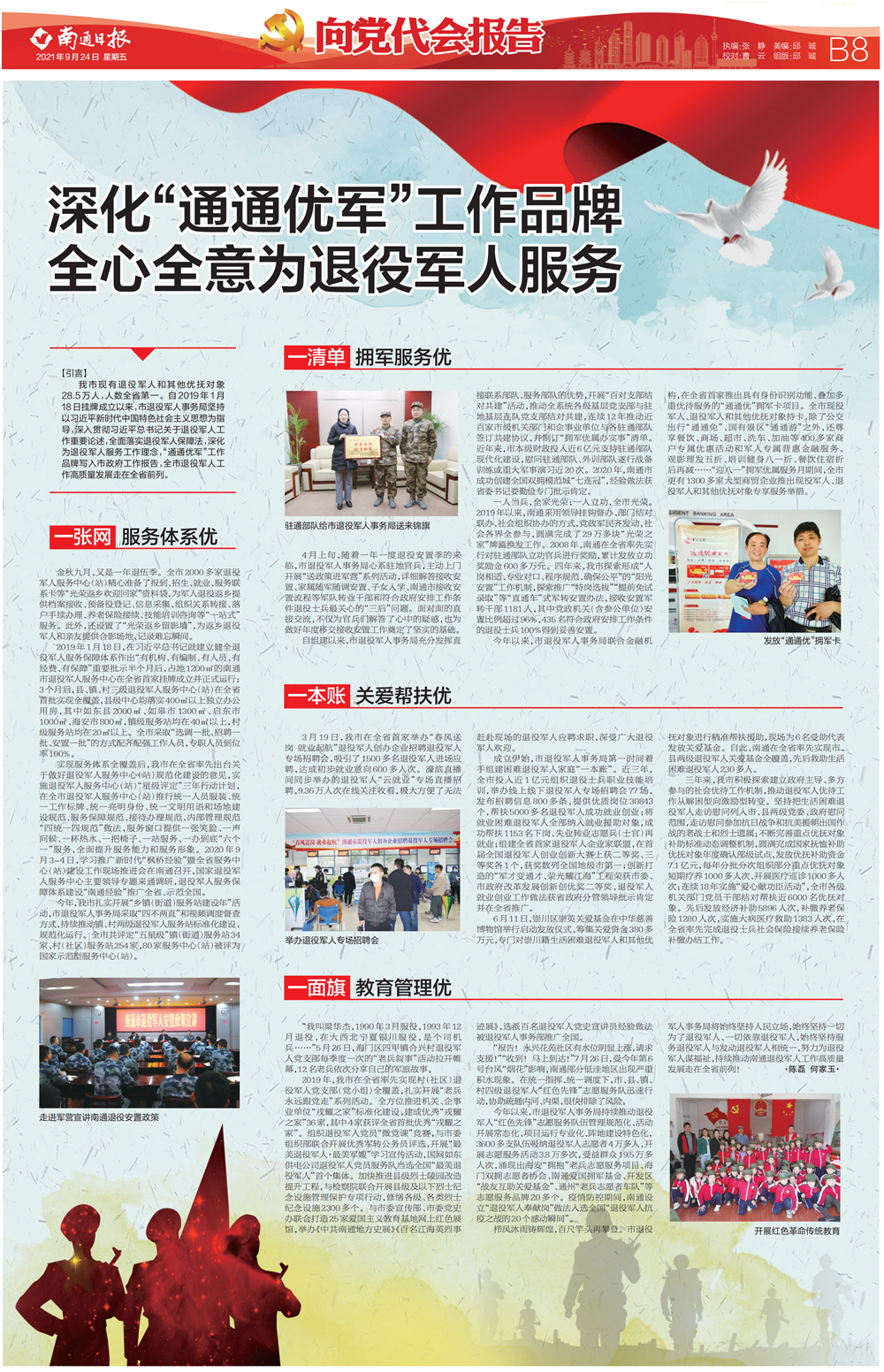 一人当兵,全家光荣;一人立功,全市光荣。2019年以来,南通采用领导挂钩督办、部门结对联办、社会组织协办的方式,党政军民齐发动,社会各界全参与,圆满完成了29万多块“光荣之家”牌匾换发工作。2008年,南通在全省率先实行对驻通部队立功官兵进行奖励,累计发放立功奖励金600多万元。四年来,我市探索形成“人岗相适、专业对口、程序规范、确保公平”的“阳光安置”工作机制,探索推广“特岗选拔”“提前免试录取”等“直通车”式军转安置办法,接收安置军转干部1181人,其中党政机关(含参公单位)安置比例超过96%,435名符合政府安排工作条件的退役士兵100%得到妥善安置。