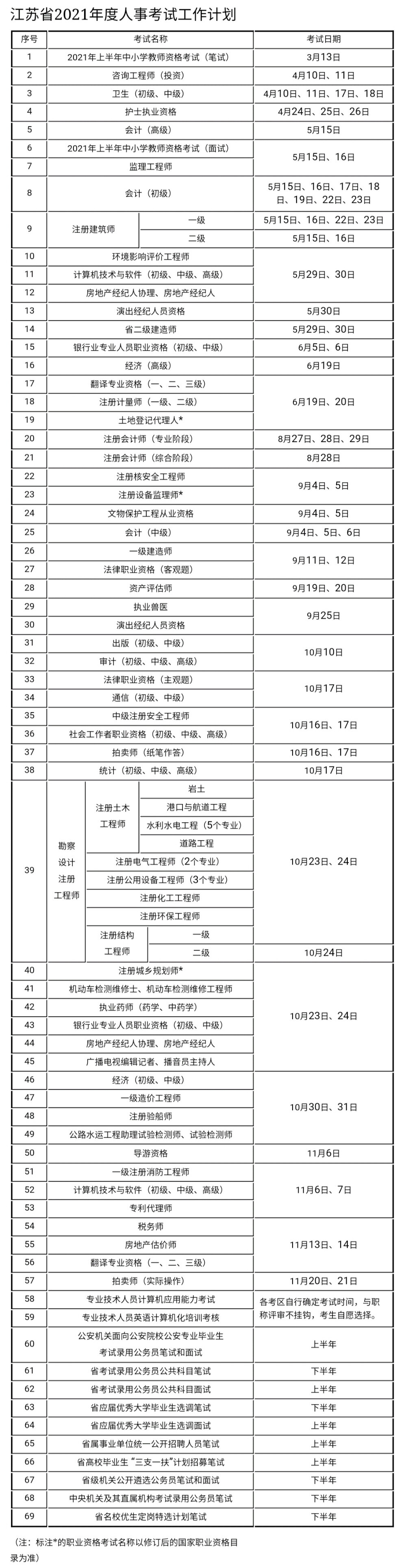 2月22日,现代快报记者获悉,江苏省人社厅日前印发江苏省2021年度人事考试工作计划,2021年考试“日历”中总共有69项考试。